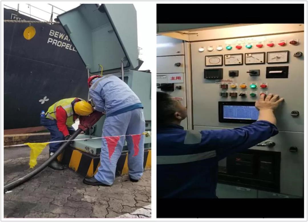 924日下午接到客戶緊急連船任務(wù)后,智光電氣技術(shù)港口部與技術(shù)服務(wù)部立即協(xié)調(diào)人員趕往現(xiàn)場(chǎng),并在25日對(duì)兩套岸電設(shè)備進(jìn)行全面檢查及通電調(diào)試,與船方、港方溝通確定連船方案。926日,智光電氣技術(shù)岸電系統(tǒng)分別在802#泊位、803泊位,與神華521”輪發(fā)電機(jī)實(shí)現(xiàn)一次性成功并網(wǎng)、解列任務(wù)!