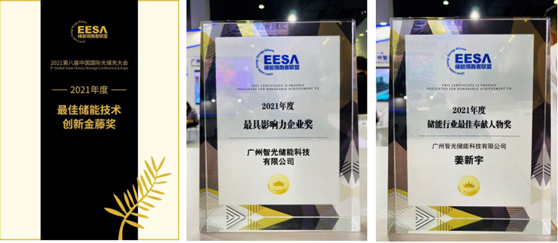 本次大會上,智光儲能獲得“2021年度最佳儲能技術創新金藤獎“2021年最具影響力企業獎;廣州智光電氣股份有限公司副總裁、總工程師兼智光儲能董事長姜新宇先生榮獲“2021年度儲能行業最佳奉獻人物獎